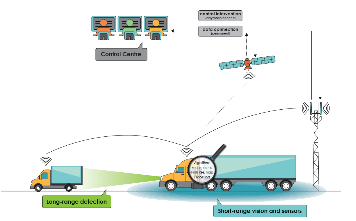 The control centre model for driverless trucking on motorways seems to be a feasible path towards fully-automated trucks. It would also be directly applicable to other areas currently relying on professional drivers, such as taxis and buses. The significant cost savings would be attractive to operators, while the availability of drivers as a fall back in case of system failures could allay concerns about giving full responsibility to a robot.