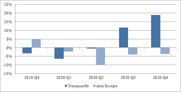 Changes in deployed container ship capacity on different trade lanes (YoY)